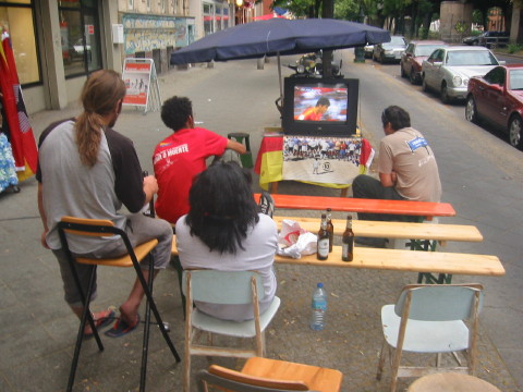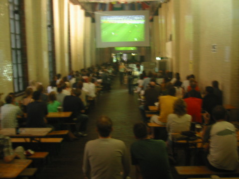 Unfortenately Switzerland lost yesterday...how do they wanna win if they miss 3 penalties?? Also disapointing was Brasil vs. Togo (3:0). Togo, defenitely better missed the goal, and Brasil won in the end. I spend that match at the public view area 'Fan Mile' in front of the 'Brandenburg Gate' and left in the 65th minute as it was such a boring match. For the match of France vs. Spain (3:0) I met again Juliane and Nico at 'Prenzlauer Berg' in a former Electricity Building. A huge hall with 2 screens gave me more the impression of people in a jail house having their lunch.... |