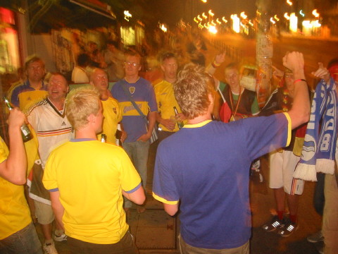 Swedish fans and one argentinian Boca Junior (center, with a blue 'Quilmes' jersey). |